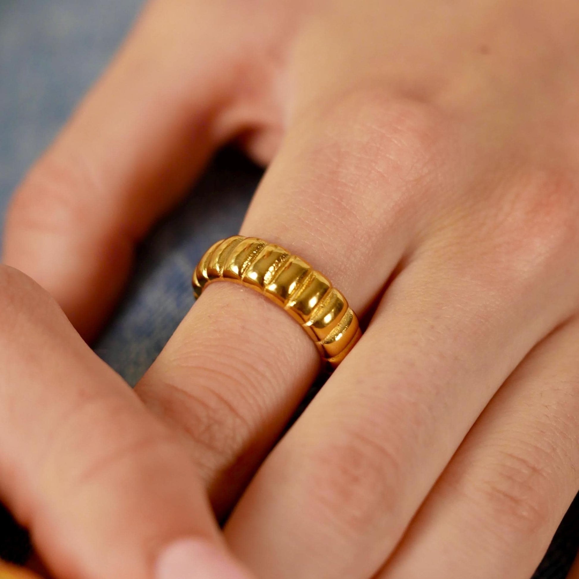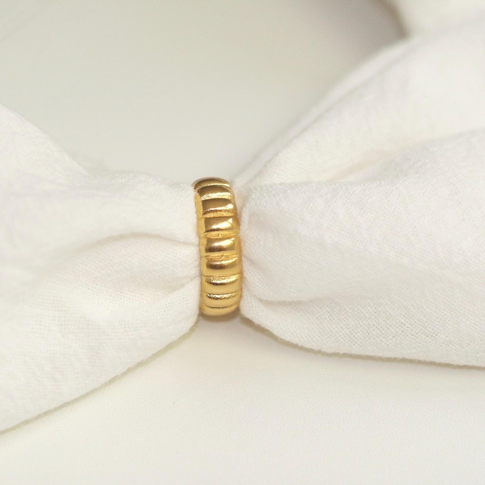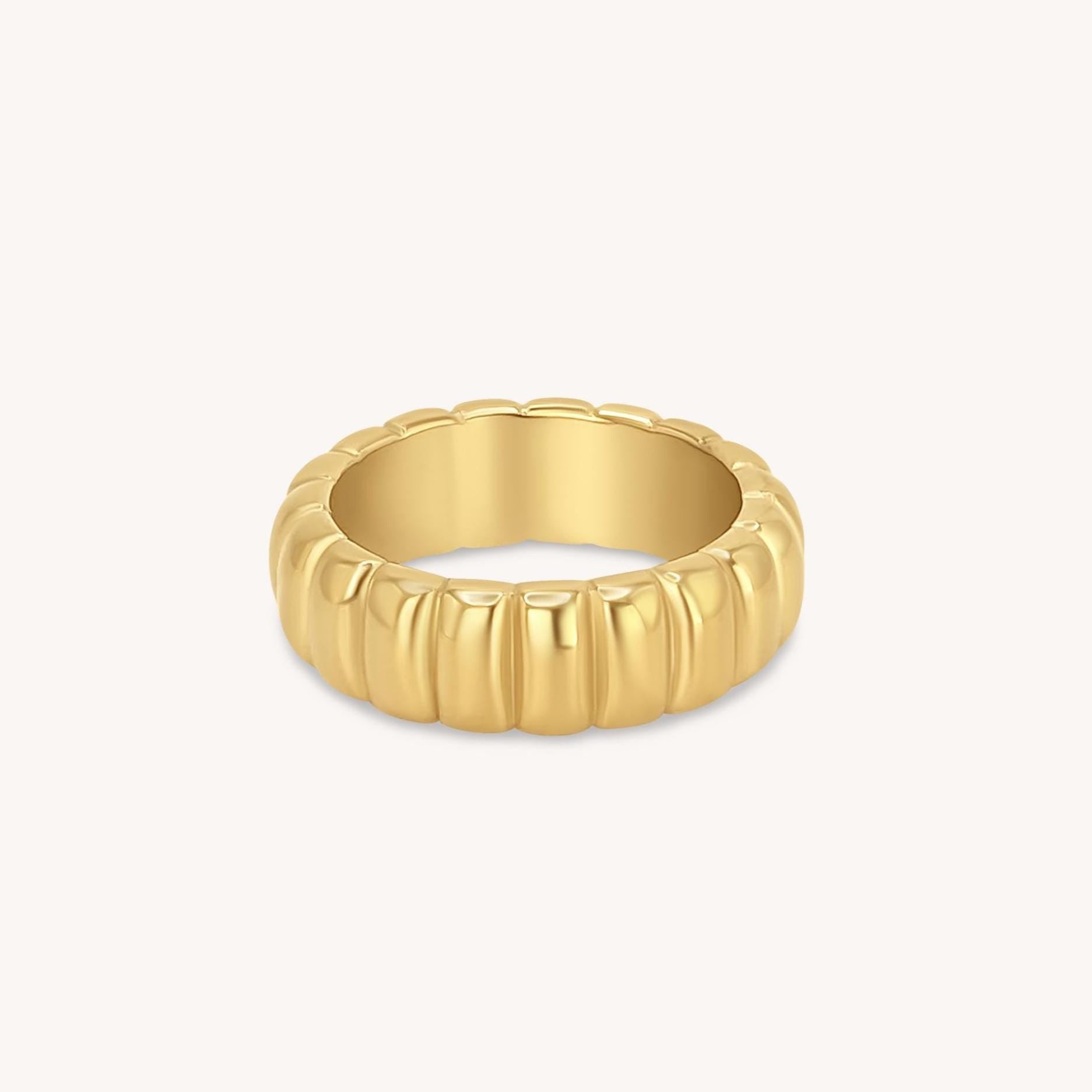 This ring is the perfect mix of bold and easygoing. With its twisted, dome shape and golden glow, it makes a statement without trying too hard. Stack it or wear it alone, either way, it just works!