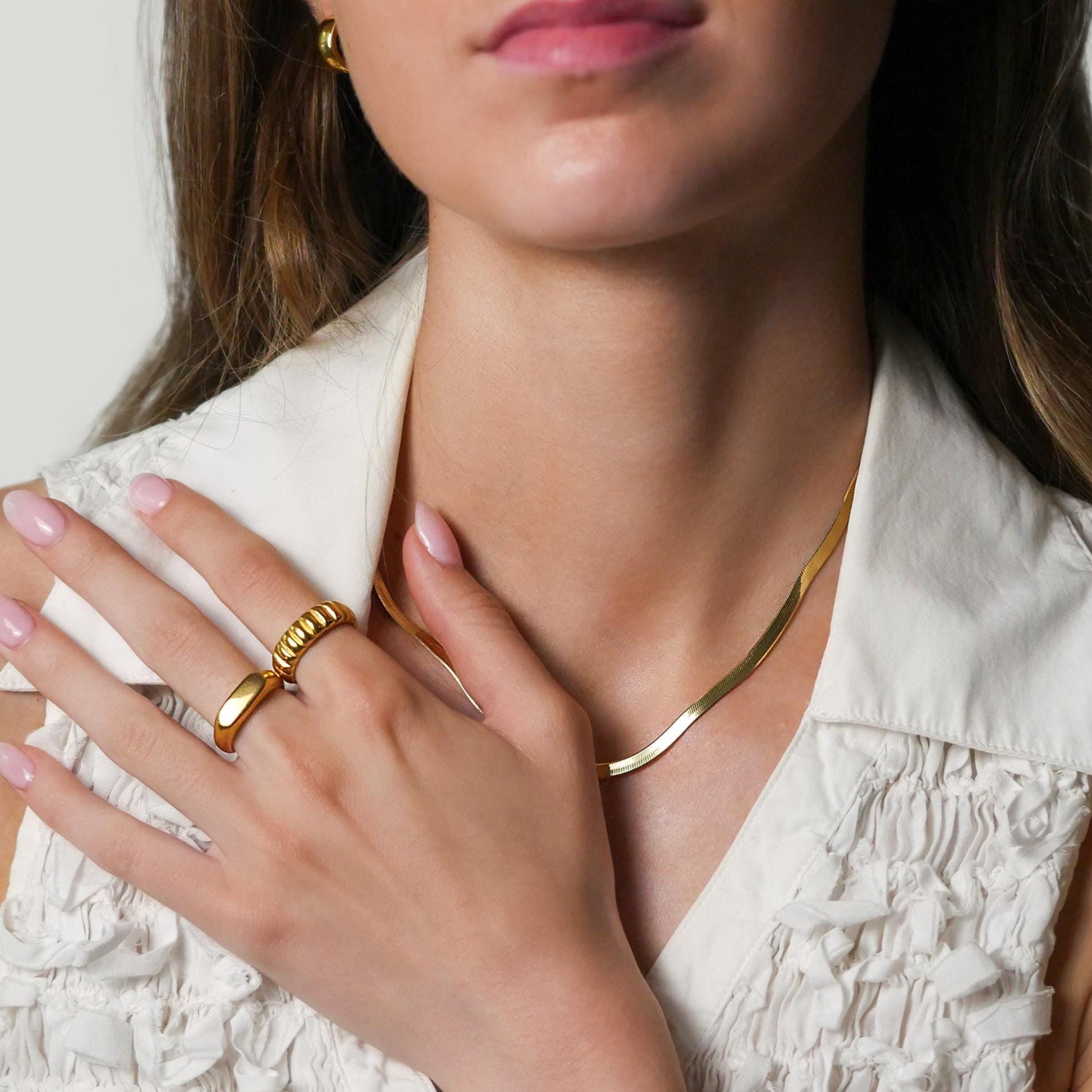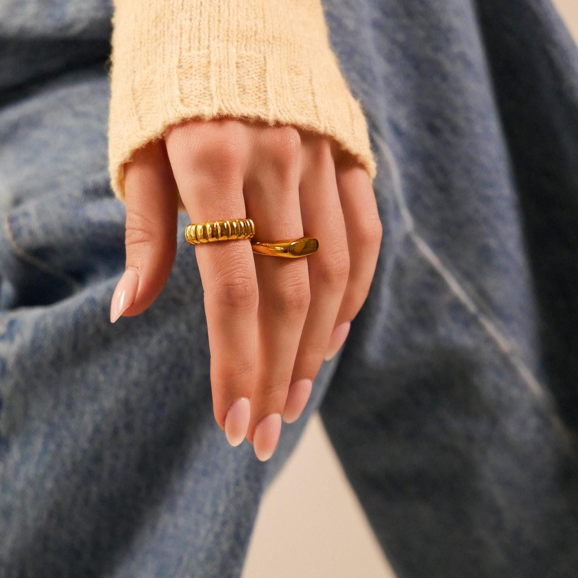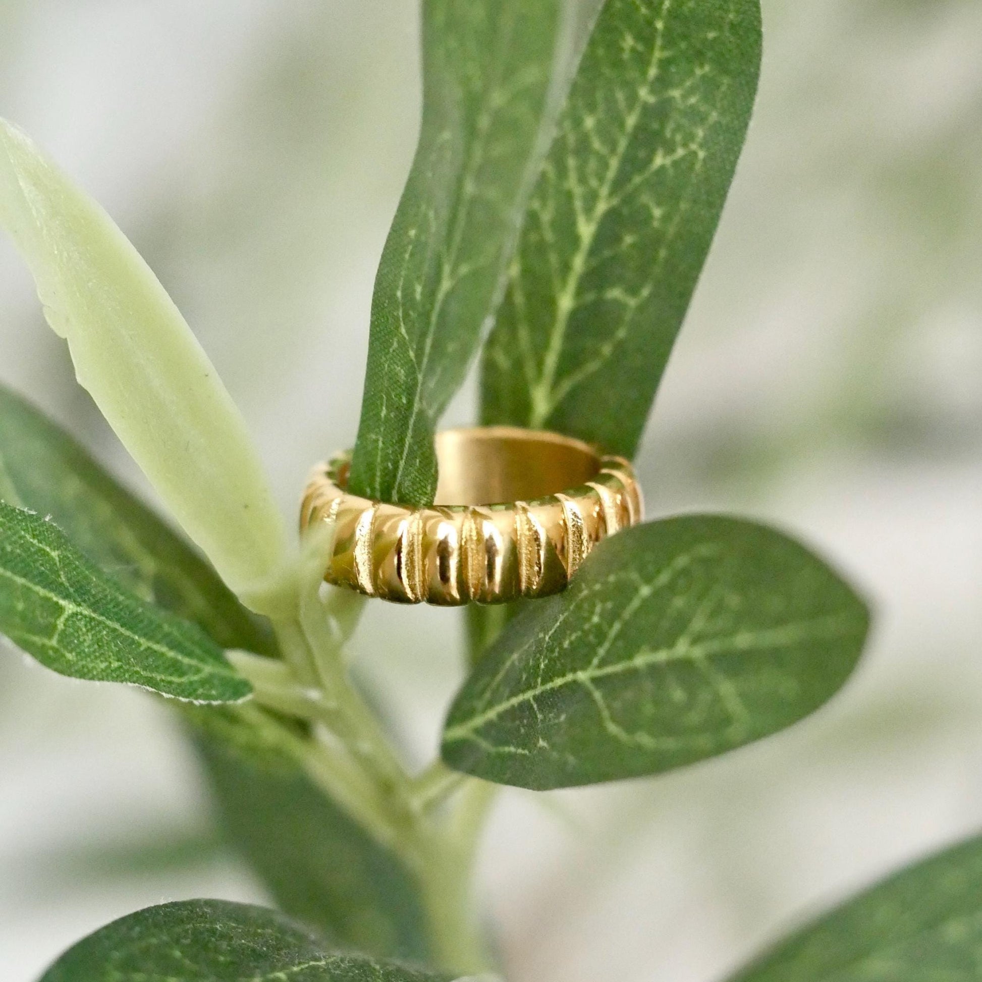 This ring is the perfect mix of bold and easygoing. With its twisted, dome shape and golden glow, it makes a statement without trying too hard. Stack it or wear it alone, either way, it just works!